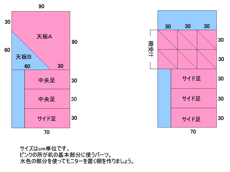 棚の高さを自由に変えたい場合は適当な間隔で穴を開けて、ボルト等を刺し、三角の板を載せる感じにしてください。