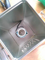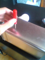 | 7 | 電球のコードを出す穴を側面下に開けます 横に置いて使用する場合は下にならない部分に開けてください。 今回は蓋の金具のある面に開けました。 穴を開けたらコードが通る太さまで拡張してください |