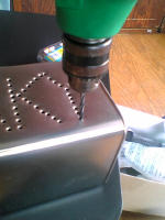 | 5 | 穴をドリルで拡張します。 好きな大きさの刃を使って開けていきましょう。 ここで使わない板を内側に仕込んでやらないと、穴が歪む&凹みます。 |