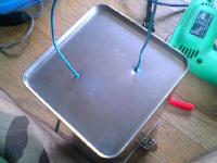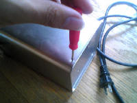 | 6 | 電球を固定するための穴を底に開けます。 左の写真のように、ソケットを置いて穴を開けると正確に開けられます。 開けたらドリルで拡張してネ! |