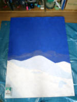 | 1 | まずは簡単に単色でベタ塗りします。 それぞれの部分に一番多い色を載せるがいいと思います。 今回は空と雪山がメインなので、青と白の2色のみ。 ひたすら絵の具を消費します。 |
