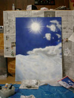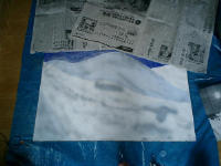 | エアブラシを使った絵です。 専門外&写真を撮り忘れたので説明は超テキトウ・・・・ 使った絵の具は白・黒・青・緑の4色のみです サイズは80x120cm 今回は写真を元に作成しましたが、見本にいかに近づけるかというよりは、いかにそれっぽく見せるかに重点を置いた方が綺麗に仕上がると思います。 |
