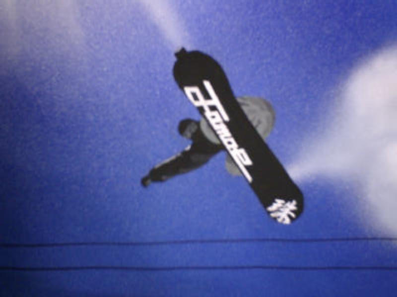 | 5 | スノーボードには依頼人の名前をデザイン。 上の絵を見ると分かるように、少し高くジャンプさせすぎたみたいです。 |