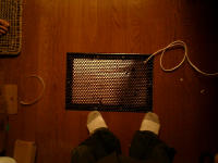 今回の部屋の最大の魅力。 コンクリ作りのこの部屋には床に通気口が4つ開いていて、地面が見えるつくりだったので、私の大好きな電球を仕込んでみました。風が漏れて寒いということだったので、障子紙の耐久性の強いものをつかい柔らかい光+風の進入を防ぐ効果があります。 |
