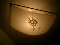 下のライトの中に柄を入れてみました。ちなみに柄は適当にトライバル模様風に画用紙を切り、和紙の上に載せただけです。適当に模様を入れたわりには、カッコよく出来ました。 |